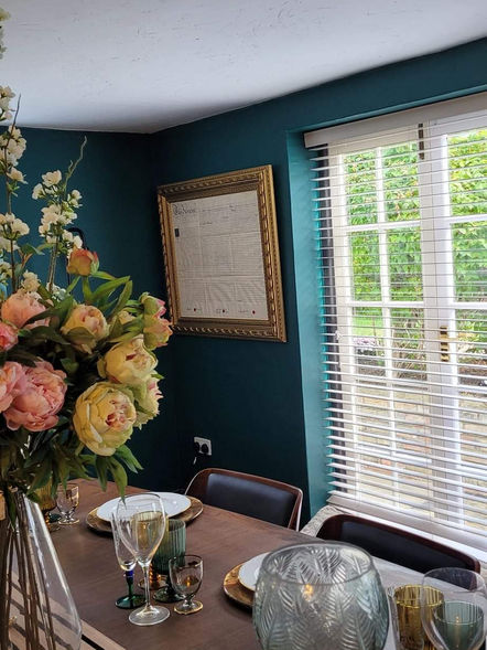 Convert this large living room in to a sumptuous warm dining room. Love dark greens, hate curtains, must allow as much light in to the room as possible. Must be able to fit a large dining table and storage for glassware/crockery.